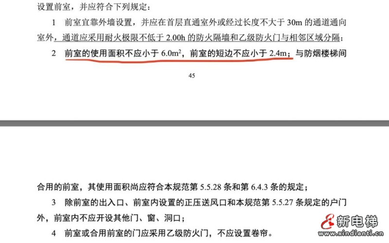 《建筑设计防火规范》中明确写道,消防电梯应设置前室,且对前室面积做出了具体的数字规定:“前室的实用面积不应小于6㎡,前室的短边不应小于2.4m”。